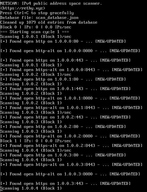 The core of the NETSCAN program. Scans all public IPv4 internet addresses in order from lowest to highest, looking for commonly exploitable ports. If found, they are logged in a JSON database for further action.